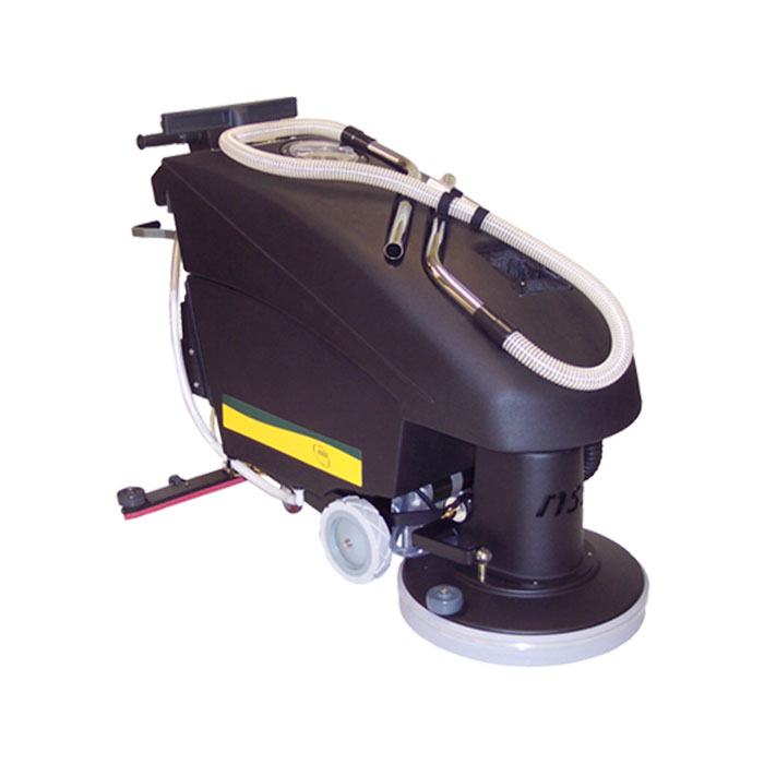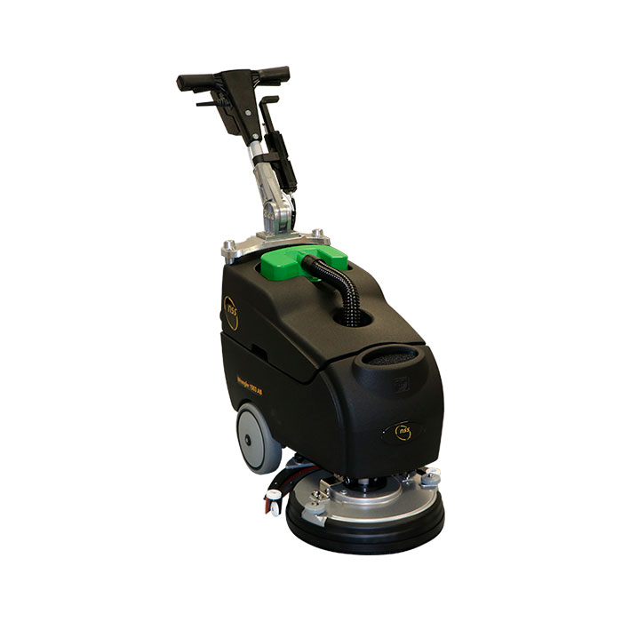 Lavadora automática de pisos, diseño compacto y ergonómico. Ideal para áreas de hasta 1400 m2. Jalador ubicado detrás del cepillo. Silencioso: 65 dBA. Productividad por hora: 930 m2