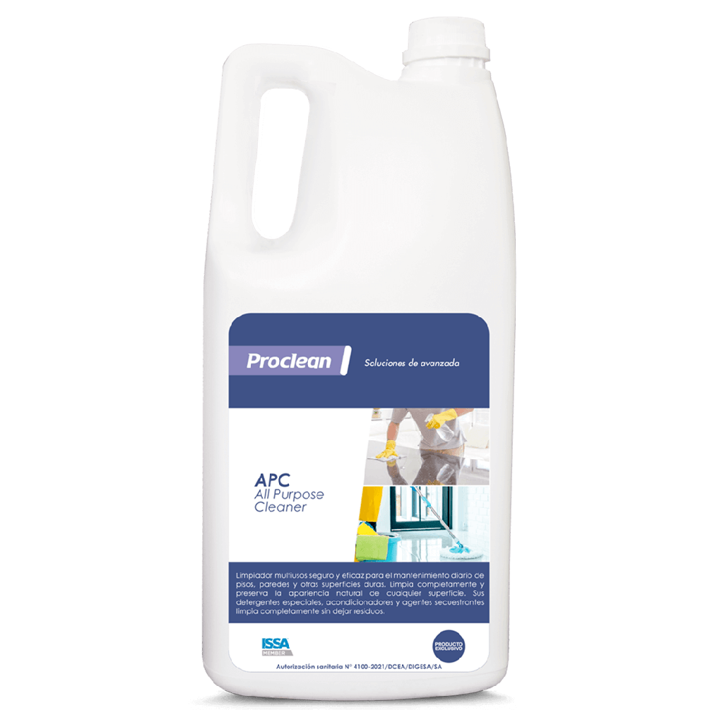 Limpiador multiuso APC seguro y eficaz para el mantenimiento diario de pisos, paredes y otras superficies duras. Limpia completamente y preserva la apariencia natural de cualquier superficie. Los detergentes especiales, acondicionadores y agentes secuestrantes limpian completamente sin dejar residuos ni marcas, además es útil para corregir pisos percudidos. Es Eficaz, Rápido y Seguro.