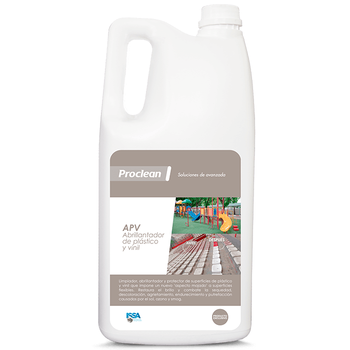 Nuestro APV es fabricado a base de un pulidor micronizado; contiene antioxidantes, emulsores, agentes antiestáticos y absorbentes UV para devolver a las superficies de plástico, vinil, cuero y otras su condición original. Restaura el brillo y protege superficies. Imparte un lustre profundo protegiendo contra la sequedad, descoloración, agrietamiento, endurecimiento y putrefacción causados por el sol, ozono y smog. Disipa la carga estática; en realidad, retarda la atracción de polvo y otras partículas aerotransportadas.
